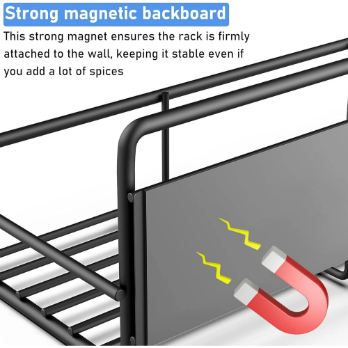- The IZEYNO magnetic spice rack is made of sturdy metal steel, which is rust proof, waterproof, and stable. The spice rack adopts a black matte and polished finish, which will not rust and is durable and beautiful, helping you keep the kitchen clean.