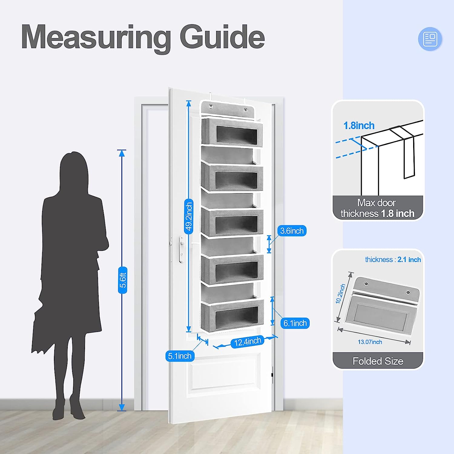 IZEYNO Over the Door Organizer with 5 Large Pockets is suitable for hanging to the door frame less than 1.8?? thick, please refer to the measuring guide in the picture before purchase. Great storage solution for pantries, nurseries, closets, bedrooms, bathrooms, kitchens, dormitories, offices. Ideal choice for storing cosmetics, magazine, hats, baby diapers, children’s clothes, toys, snack foods, stationery, slippers and other sundries.