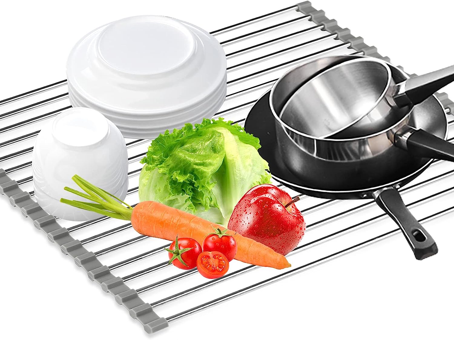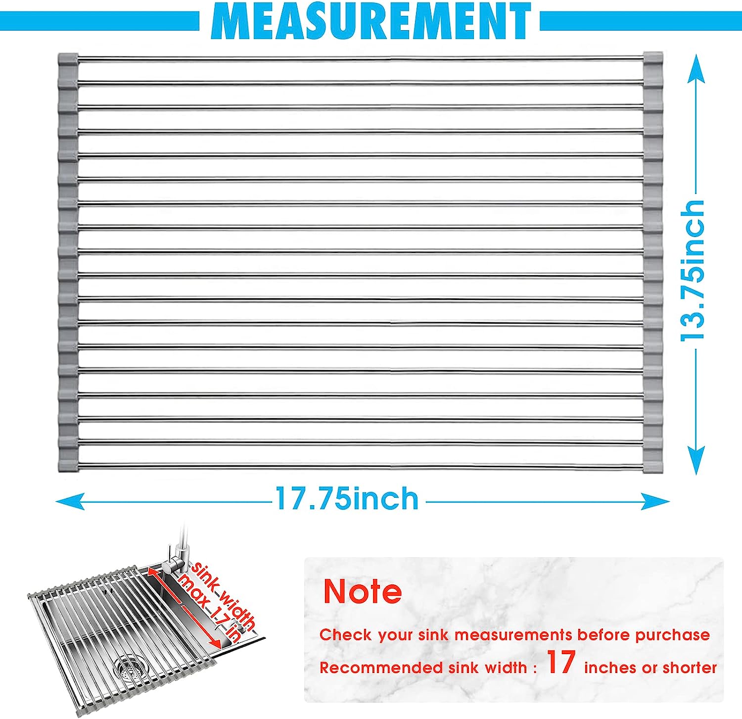 IZEYNO OVER THE SINK DRYING RACK is suitable for most kitchen sinks and counter. This item is 17.7(L) x 13.7(W) inch fits sink not wider than 16.8″. Please check your sink measurements and choose the right size before purchasing the roll up dish drying rack!